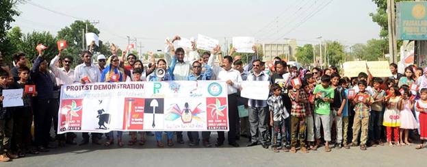 At the demonstration attended by several human rights organizations such as Peace and Human Development (PHD), Peace for Nation International (PNI), Adara Samaji Behbood (ASB) and Ever Green Foundation (EGF), who joined children and adults from different communities. During the march, participants exhibited placards and chanted slogans against child exploitation.