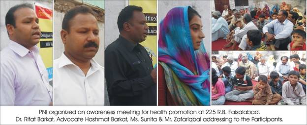 On 17th February 2015, a health promotion meeting was organized by Peace for nation international (PNI) at Kachi Abadi, Latif Chuok, Gulam Mohammad abad, Faisalabad. The awareness meeting was joined by 50 male and female participants while Dr.Rifat Barkat D.M.S. (D.H.Q.) Hospital shared causes and symptoms of the diseases and advised some precautionary measures to live a healthy life. Advocate Hashmat Barkat (Chairman PNI) shared that the budget allocated for health and education is insufficient which need to increase to provide better health and education facilities.