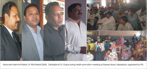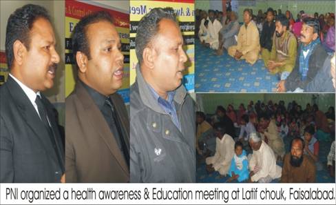 On 8th February 2015, a health promotion meeting was organized by peace for nation international (PNI) at Faizabad, Faisalabad. The awareness meeting was joined by 50 male and female participants while Dr.Rifat Barkat D.M.S. (D.H.Q.) Hospital and Dr. Gulzar Masih shared causes and symptoms of the diseases and advised some precautionary measures to live a healthy life. Advocate Hashmat Barkat (Chairman PNI) and Zafar Iqbal (Program Manager PNI) shared aim and objectives of the organization and requested the community to consult with only qualified doctors at basic health units and Hospitals for better health care.
